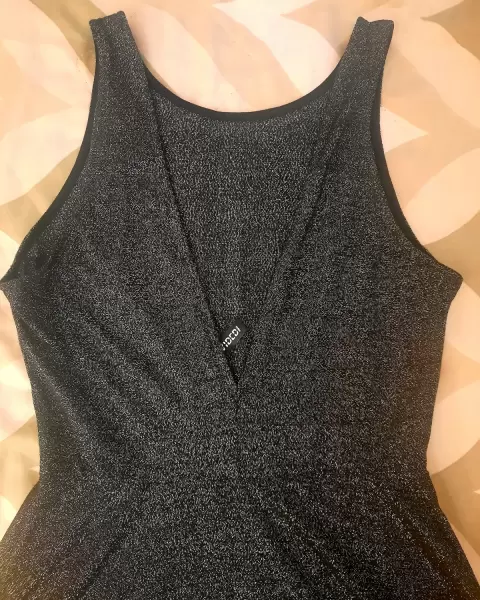 Bonito vestido negro tela brillosa, ligero y comodo. En la parte de enfrente cuello circular y la parte de la espalda escote en V. Perfectas condiciones 👌🏻 largo arriba de la rodilla.