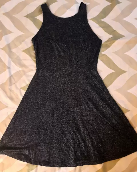 Vestido casual negro. Bonito vestido negro tela brillosa, ligero y comodo. En la parte de enfrente cuello circular y la parte de la espalda escote en V. Perfectas condiciones 👌🏻 largo arriba de la rodilla.