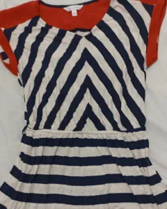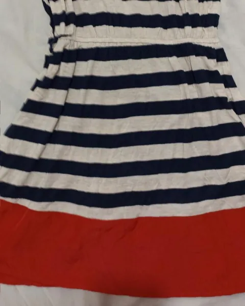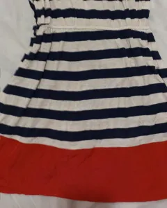 Vestido casual rayas blanco y negro con orillas color rojo, ningun detalle talla M pudiera quedarle a un G ya que la parte de la cintura se estira.