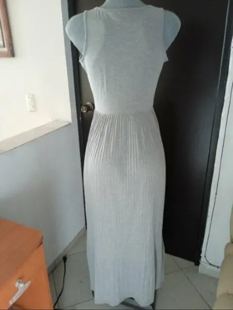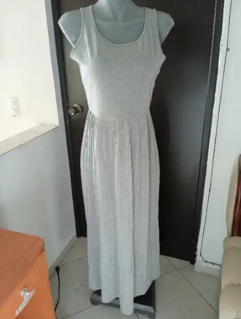 Vestido casual color gris con tela tipo camiseta, especial para el calor y para usar con sandalias o con tenis, súper cómodo. Es largo y la falda es de tablas que se van difuminando en la parte de abajo. Dice talla L, pero siento que queda mejor a talla Mediana.