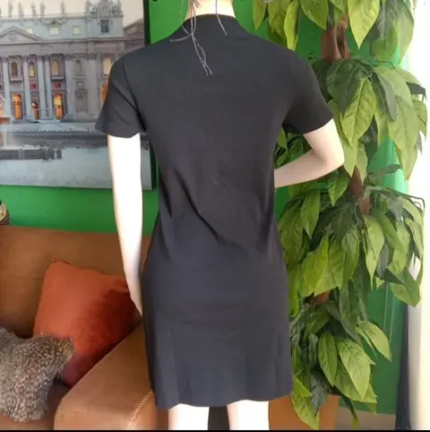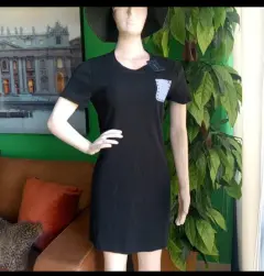 Vestido color negro estilo camiseta, escote redondo. Bolsillo de parche al frente con logo de la marca bordado al pecho. Manga corta.Talla M- hombro a hombro: 40cm- Axila a axila: 43cm- Largo: 88cmMaterial:👉100% algodónMarcas originales importadas de USA.