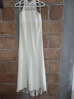 Vestido ceremonia. Vestido largo, torso con piezas de aplicaciones bordadas, espalda alta con tiras, corte princesa, más largo de atrás.