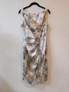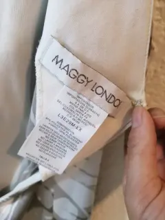 Hermoso vestido satinado color champagne. Marca MAGGY LONDON. Corte drapeado a un costado y abertura en pierna que resalta la figura. Brilla con la luz con destellos plateados a dorados según el reflejo. Textura sedosa y suave. Talla 6. 45cm de axila a axila y 35 cm de cintura (frente) Estira un poco. Cómodo. Ligero desgaste, imperceptible como en última foto. Usa el cupón VEST10 para un 10% de descuento extra.