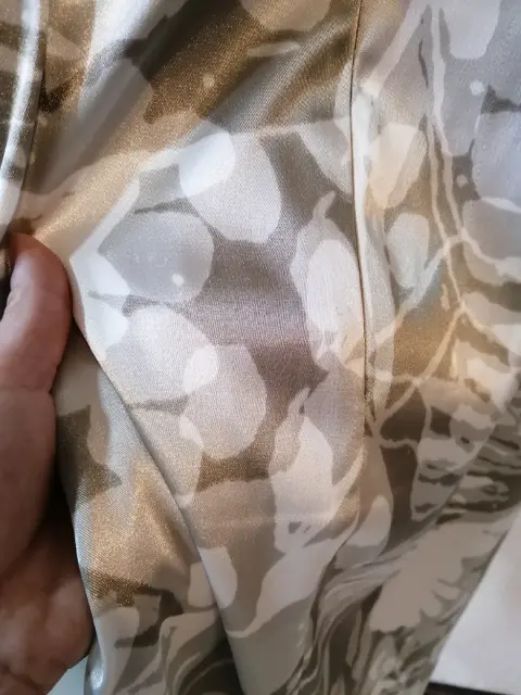 Vestido CHAMPAGNE MAGGY LONDON satinado. Hermoso vestido satinado color champagne. Marca MAGGY LONDON. Corte drapeado a un costado y abertura en pierna que resalta la figura. Brilla con la luz con destellos plateados a dorados según el reflejo. Textura sedosa y suave. Talla 6. 45cm de axila a axila y 35 cm de cintura (frente) Estira un poco. Cómodo. Ligero desgaste, imperceptible como en última foto. Usa el cupón VEST10 para un 10% de descuento extra.