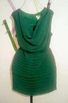 Vestido color verde bandera con detalle de escote olgado, tela fresca (no sé transparenta ya que todo tiene forro), detalles tipo corrugado en la parte de la falda, tiene un listón (tipo cinturón) para ajustarse a la figura.Dice talla xg pero queda a talla GSólo se usó 1 vez (en excelente estado)