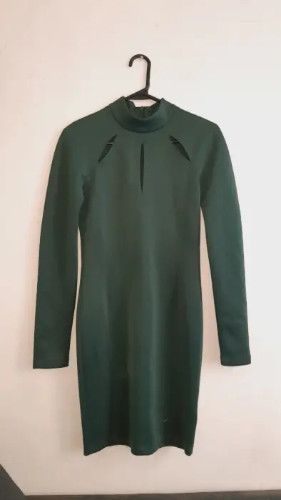 Vestido discreto y elegante, ideal para cena o ceremonia informal, manga larga con cuello, color verde botella