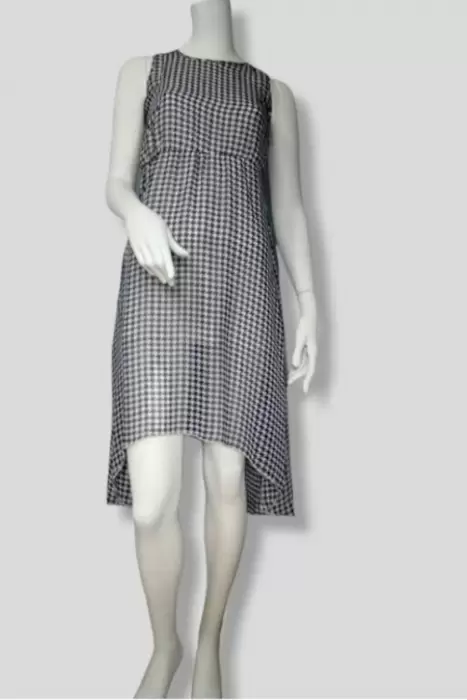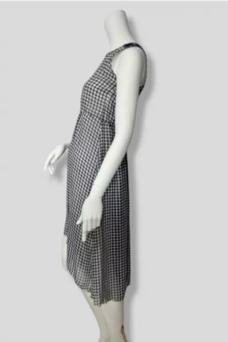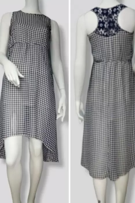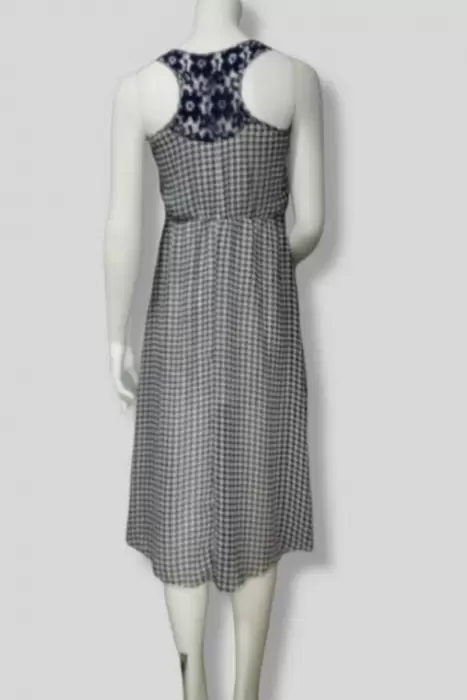 Vestido cola de pato. Vestido de gasa a cuadros blanco con azul, cola de pato, con diseño tipo guipure en espalda.