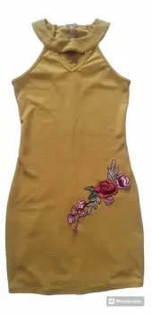 Vestido color amarillo con detalle de una rosa. Vestido color amarillo con un divino detalle de una rosa a la altura de la pierna, sin hombros, es un vestido corto, resalta tus cualidades. Al tenerlo puesto es una belleza 😍