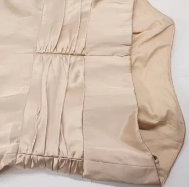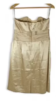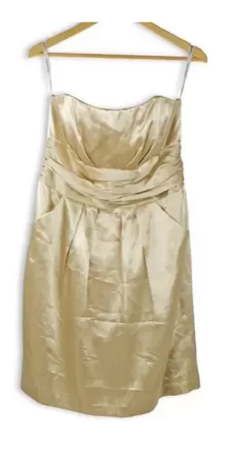 Vestido color champán de cocktail Talla L. Vestido color champán de cocktail con drapeado en el escote tela brillosa con muy buen peso para darle una linda caída al vestido, ideal para graduaciones, bodas, fiestas, eventos, cena.