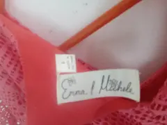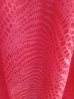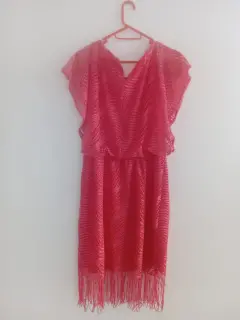 Vestido color coral con barbas de adorno. Talla mediana sin mangas trae forro interno largo hasta antes de rodilla y cuelga adorno tiritas de hilo