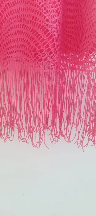 Talla mediana sin mangas trae forro interno largo hasta antes de rodilla y cuelga adorno tiritas de hilo