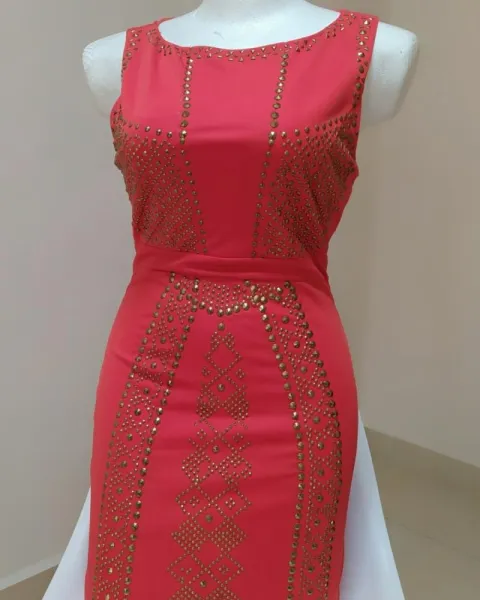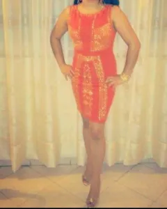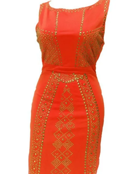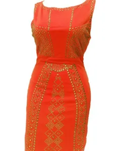 Vestido color naranja con pedrería en color oro que llega hasta la rodilla. Talla S. Un solo uso. Está en perfectas condiciones y te hará lucir una increíble figura en esa fiesta tan esperada.