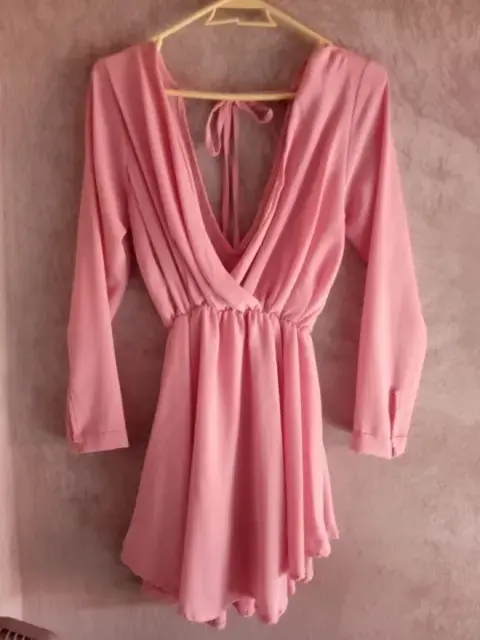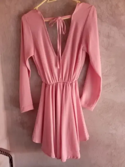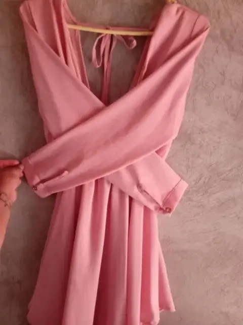 Lindo vestido color vino de vuelo ,de tela muy fresca y de manga larga ,trae dos pequeñas cintas para amarrar por atrás y escote en V.