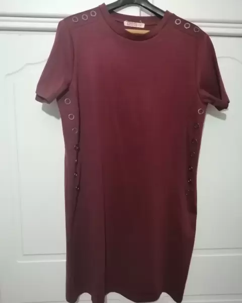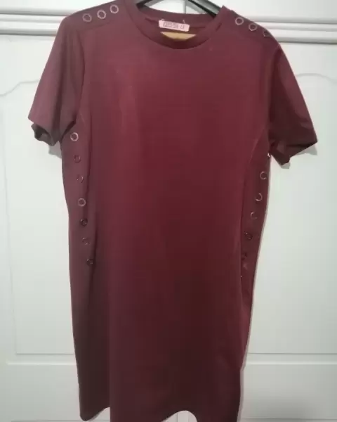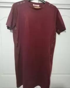 Vestido comodo. Vestido nuevo sin etiqueta color vino manga corta 95 cm de largo de axila a axila 53 cm poliester 75% viscosa20% 5%elástico de es talla xl 1 pero queda perfecto talla L estira un poco adornos en los laterales y hombros