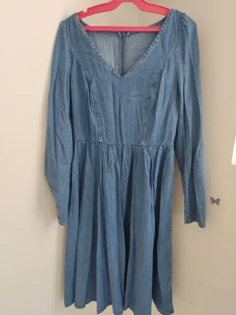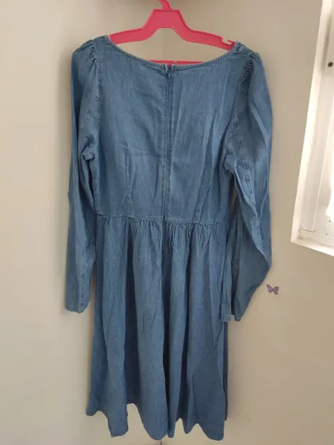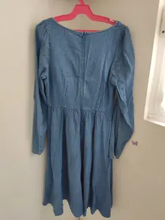 Vestido azul, tipo mezclilla, manga larga, marca Shein. Lavable en lavadora. Tiene solo una puesta.