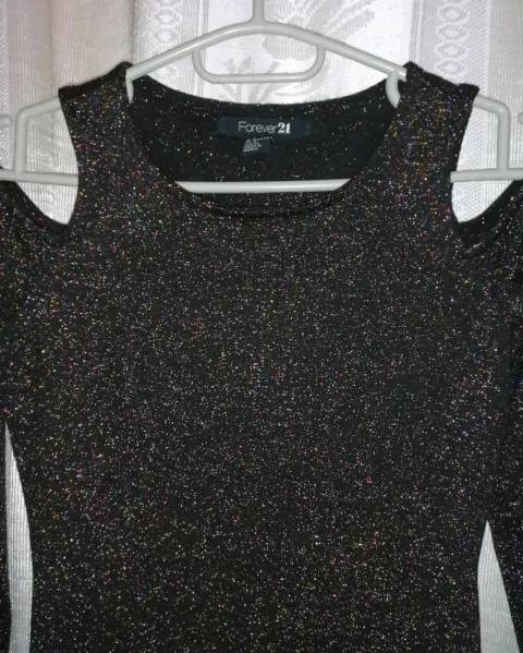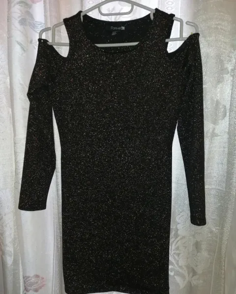 Vestido con brillo negro. Bonito vestido que se amolda al cuerpo semi nuevo solo me lo probé y no me quedó le va bien a una talla S por que a la M queda muy ajustado brilla mucho pero no se le cae nada de brillos.
