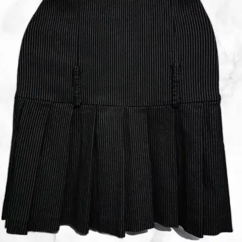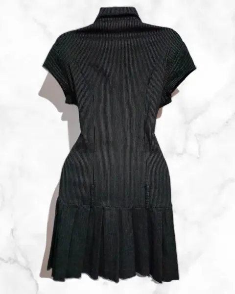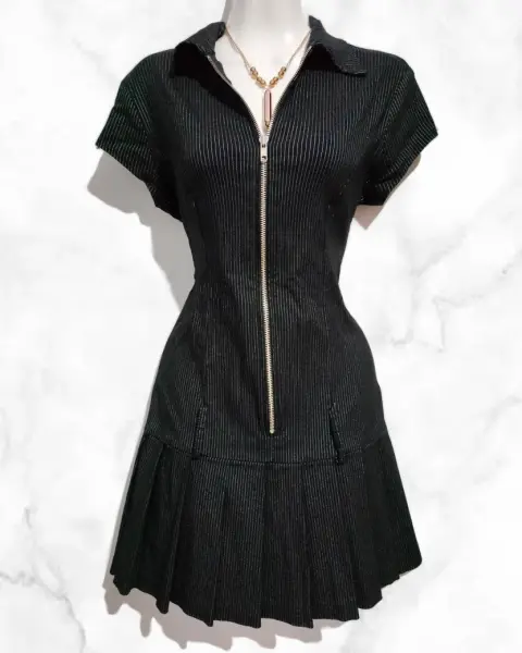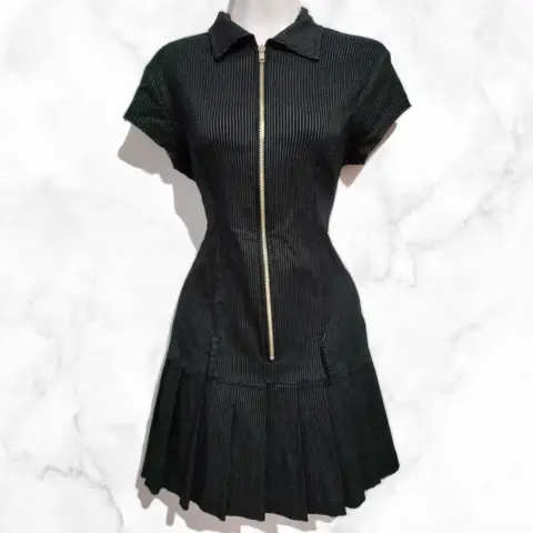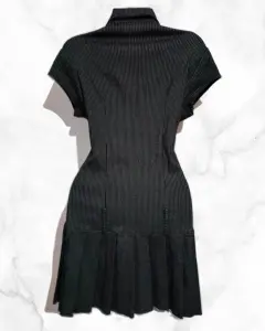 Vestido con con cierre falda tableada. Vestido negro con cierre largo, líneas blancas delgadas. debajo de la pompi inicia una pequeña falda tableada La Tela es stretch Medidas sin estirar y de lado a lado 82 cm de largo 45 cm de axi-axi35 cm de cintura (aún estira más) 40 cm Dónde inicia el tableado