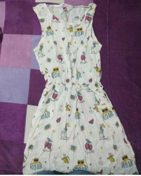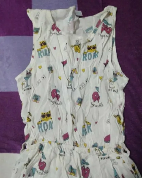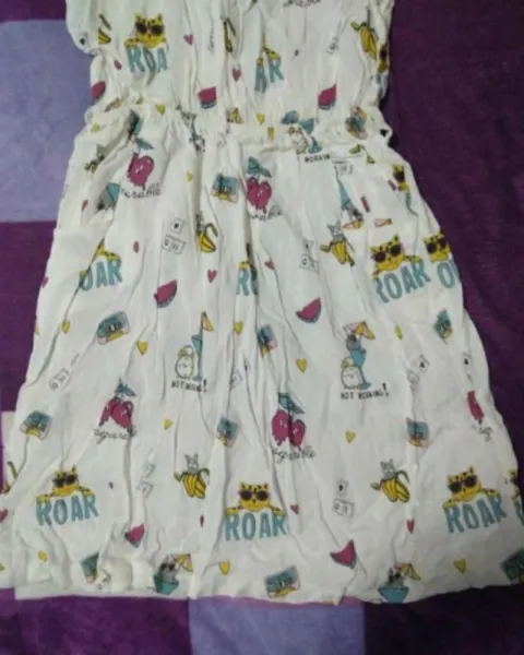 Vestido beige con figuras de gato en la parte de la cintura tiene resorte