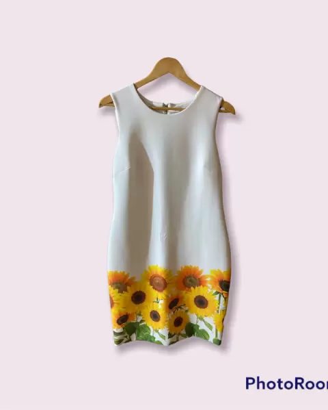 Vestido con estampado de girasoles. Vestido blanco con estampado de girasoles en la falda, sin manga