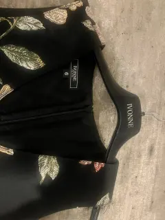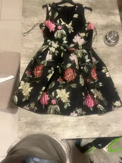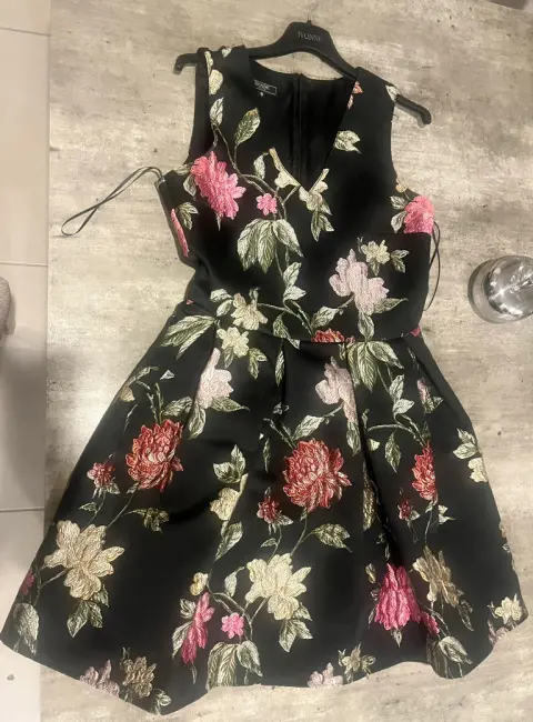 Vestido negro con flores bordadas en rosa, rojo y verde, en perfecto estado.