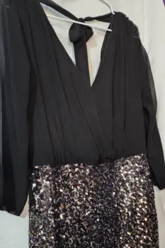Vestido de noche corto mide 90cm en la parte de arriba es como velito y de lentejuela, puesto dos veces