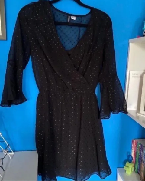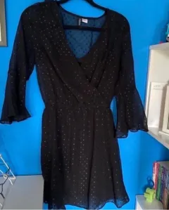 Hermoso vestido negro con lunares, l tela es transparente pero trae un fondo negro, las mangas están hermosas!!!
