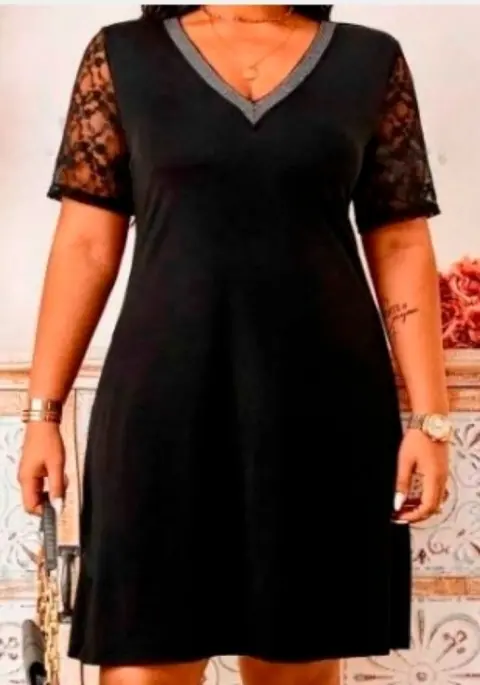 Vestido con mangas de encaje y brillos en el cuello V 112 cm pecho, 136 cm cadera, 100 cm largoEnvio a la brevedadTodas las compras incluyen obsequioAcepto ofertas