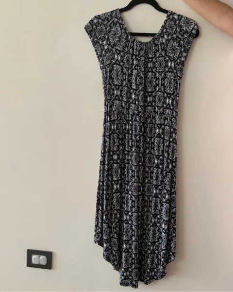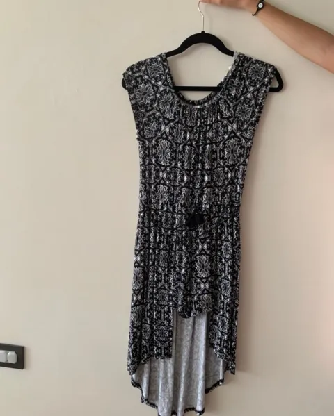 Vestido con short. Un vestido largo con short, es negro con blanco y estampado de flores, tiene un cinturón de cuerda.
