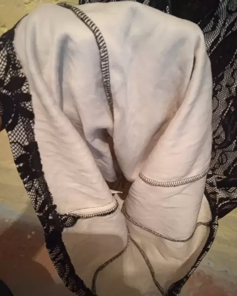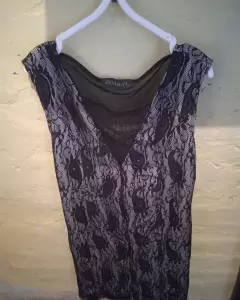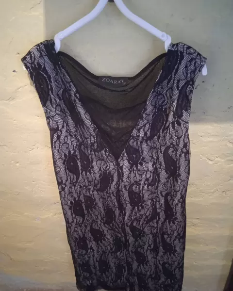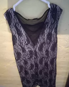 Vestido con trasparencias sutiles. Vestido abajo o hasta la rodilla depende de la altura se ajusta al cuerpo Con cierre escondido en costado
