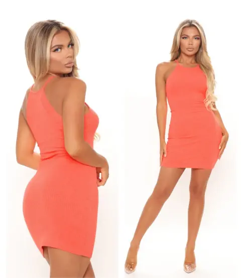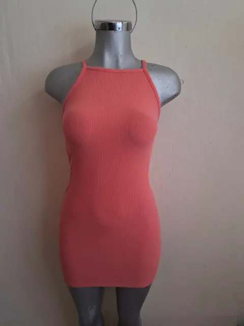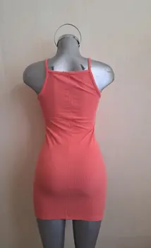 Vestido coral acanalado. Vestido ajustado de tela acanalada, color coral, corto a mediano piernas