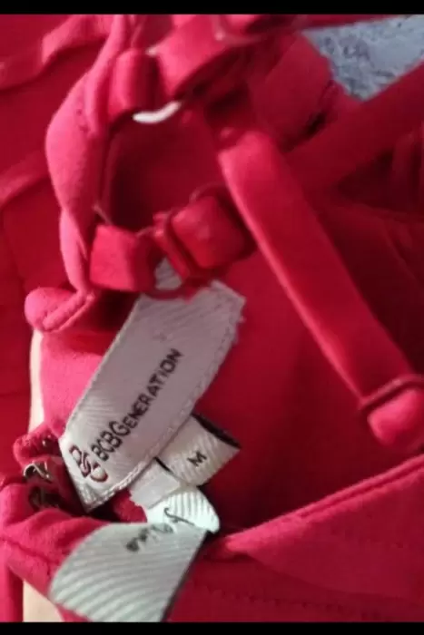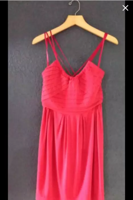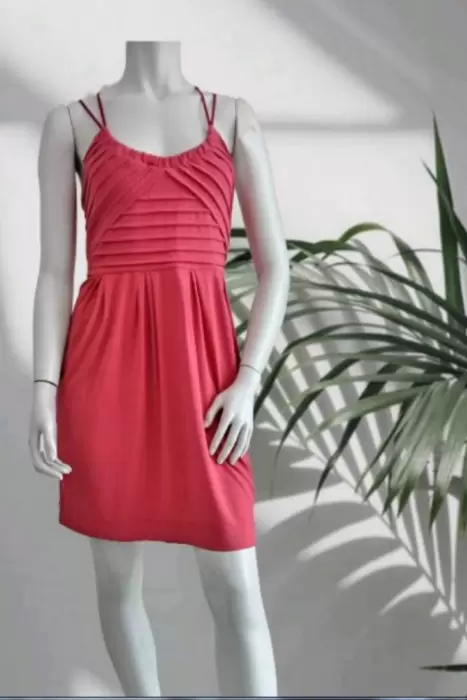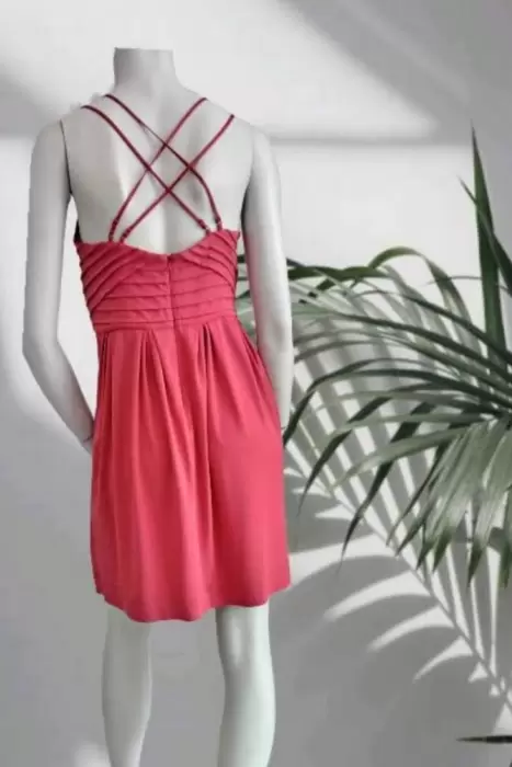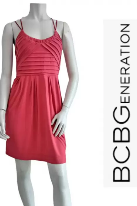 Vestido Coral BCBGeneration. Vestido corto color coral, tirantes cruzados en espalda con bolsas laterales, Tela Spandex.