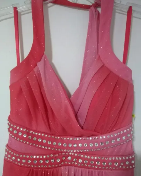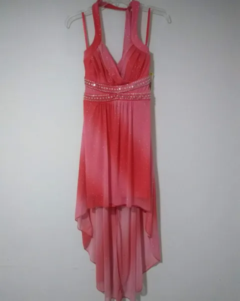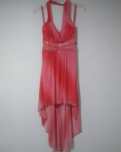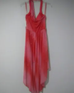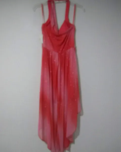 Vestido color degradado Coral con Rosa con brillos, cuello halter asimétrico con cola, no trae cierre ni botones, tiene elástico en la cintura y la espalda, la etiqueta dice M pero es como talla XS o S, ancho Axila=37-44cm, ancho Cintura=56cm, ancho Cadera=58cm, Largo=87-130cm, Te regalo $100 con mi código de descuento si es tu primera compra iuNisj3oSQ