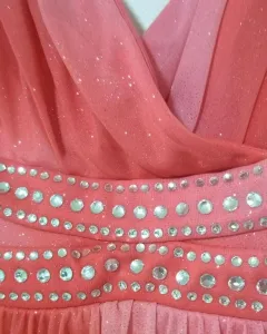 Vestido Coral Glitter. Vestido color degradado Coral con Rosa con brillos, cuello halter asimétrico con cola, no trae cierre ni botones, tiene elástico en la cintura y la espalda, la etiqueta dice M pero es como talla XS o S, ancho Axila=37-44cm, ancho Cintura=56cm, ancho Cadera=58cm, Largo=87-130cm, Te regalo $100 con mi código de descuento si es tu primera compra iuNisj3oSQ
