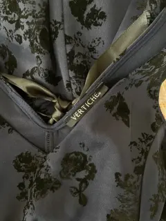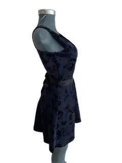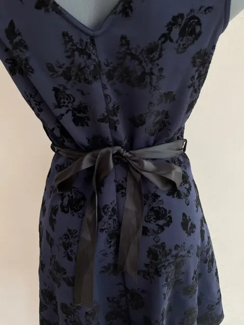 Vestido color azul marino con flores en terciopelo negras El listón de la cintura se puede quitar y poner Corte A