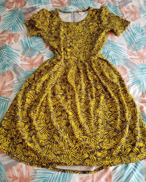 Heemoso vestido corte en A, talla mediano tela 100% strech y la manga esta bellísima ya que tiene como un elevado en el hombro que se ve coqueto.