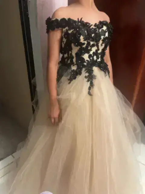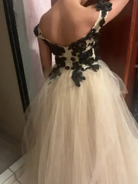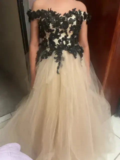 Vestido corte princesa. Vestido corte princesa en tul color nude con detalles en color negro y lentejuelas