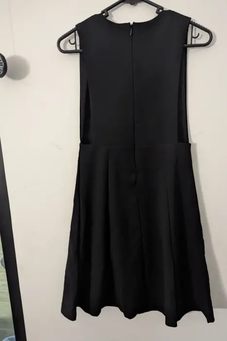 Vestido casual tipo jumper con abertura a los costados y enfrente, detalles de plate en el frente. Primera y ultima imagen de referencia.