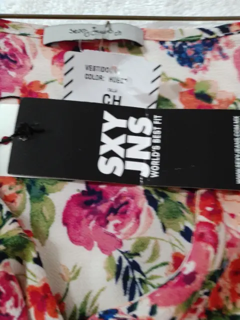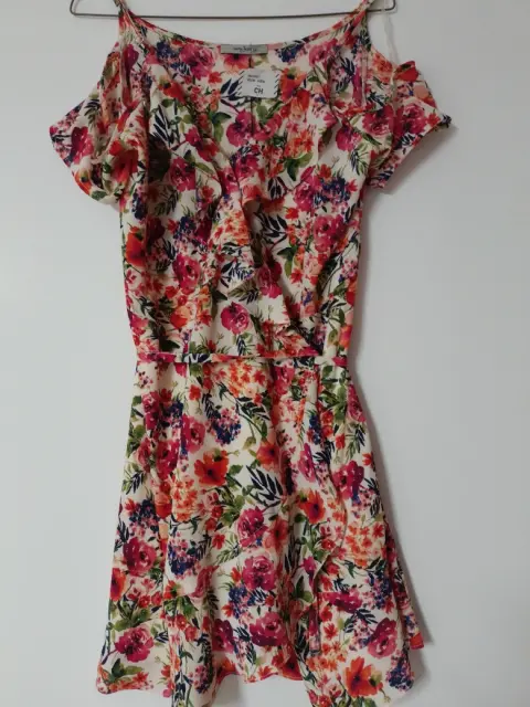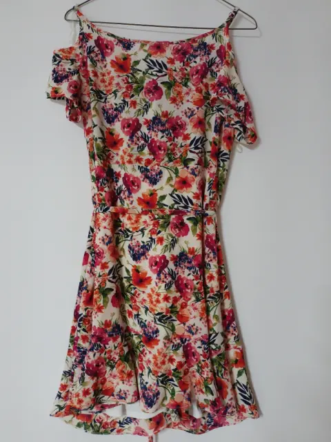 Vestido corto floreado, colores tonos naranja, corte cruzado , con tirantes y manga corta caída, corte hermoso,, completamente nuevo