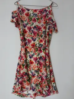 Vestido corto. Vestido corto floreado, colores tonos naranja, corte cruzado , con tirantes y manga corta caída, corte hermoso,, completamente nuevo