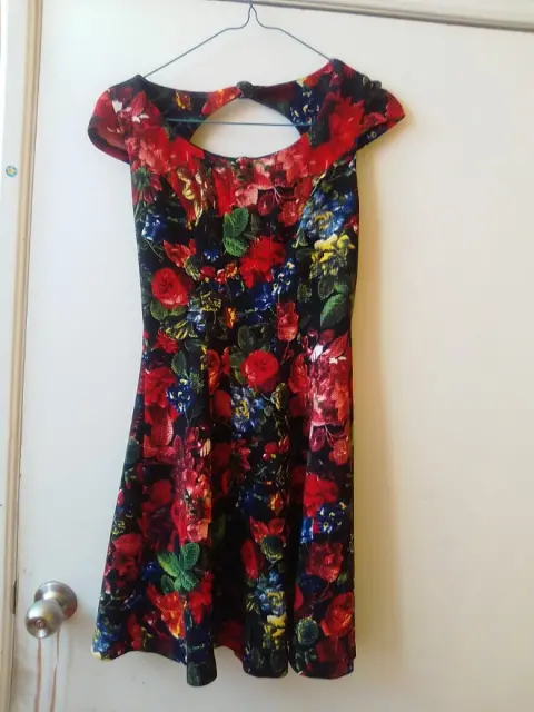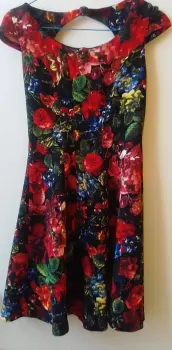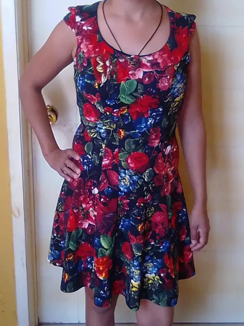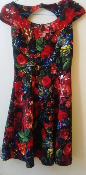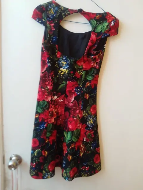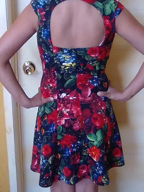 Vestido corto. Mis niñas bellas, este vestido es corto, detalles floridos, espalda abierta, se abrocha por la parte del cuello. OJO le falta un broche para cerrarlo, solo trae uno. De cuando era talla chica, ahora soy mediana y ya no se me ve bien. Ideal para una ocasión informal como cumpleaños, salidas ocasionales o para la playa.
