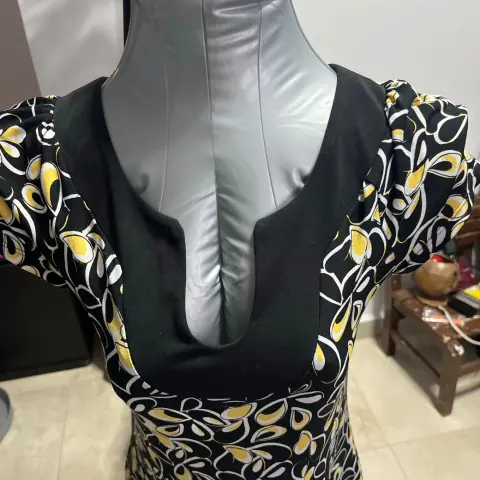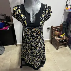 Vestido corto. Vestido corto, manga corta, caída línea A, tela muy fresca y suave, negro con blanco y amarillo.