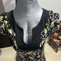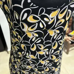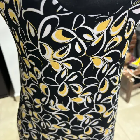 Vestido corto, manga corta, caída línea A, tela muy fresca y suave, negro con blanco y amarillo.
