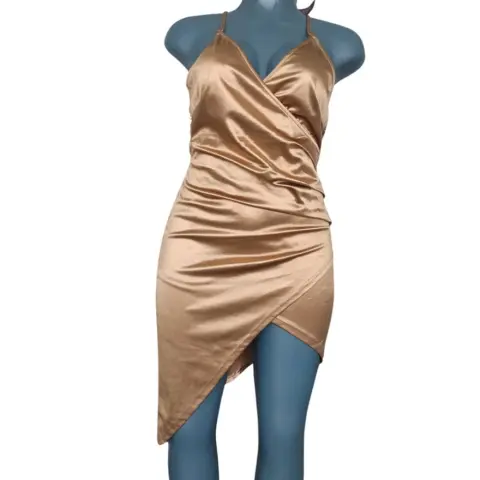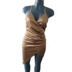 Vestido corto Fashion Nova L,viene reducido por lo que una talla M queda bien Color dorado Satinado con cierre en la parte de atrás