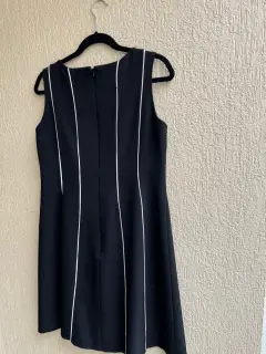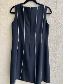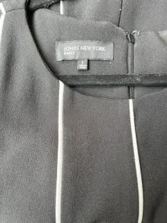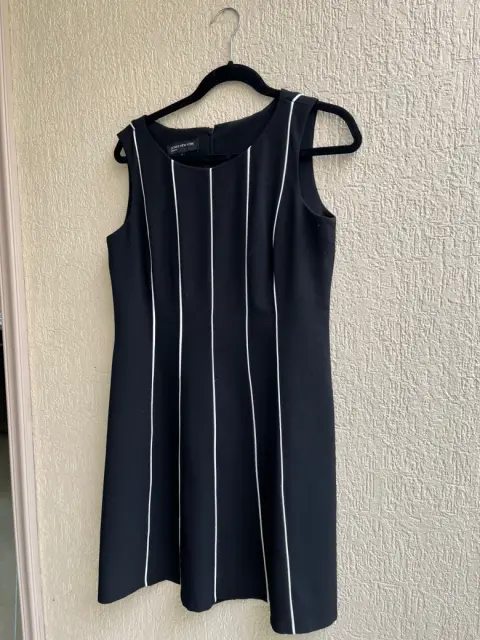 Vestido corto negro con raya fina color blanco en relieve , largo 87 cms, ancho 89, busto de axila a axila 96 cms talla chica marca JONES NEW YORK