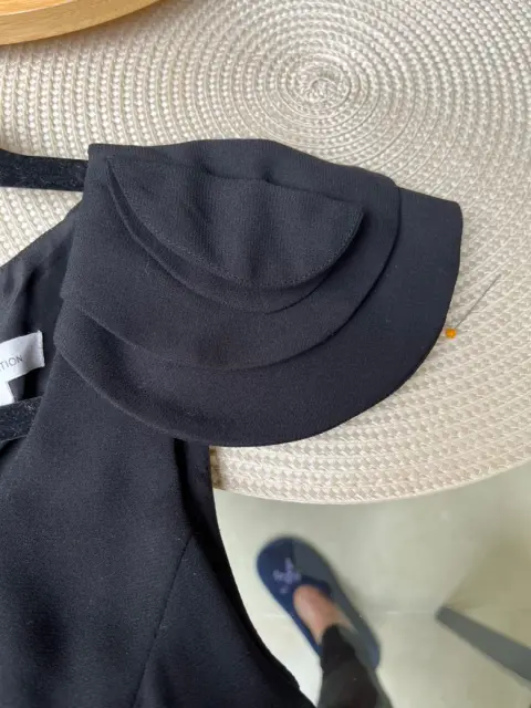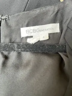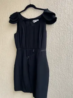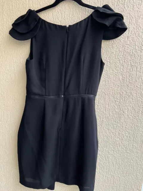 Vestido corto con cierre asimétrico delantero simulado , abarca toda la cintura medidas largo 86.5 , ancho 72 cms, busto de axila axila 90 cms con detalle en manga en capas , talla chica en la foto se ve pálido pero es negro con forro marca BCBGeneration, nuevo