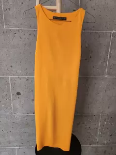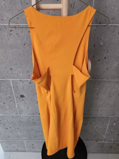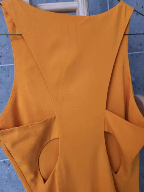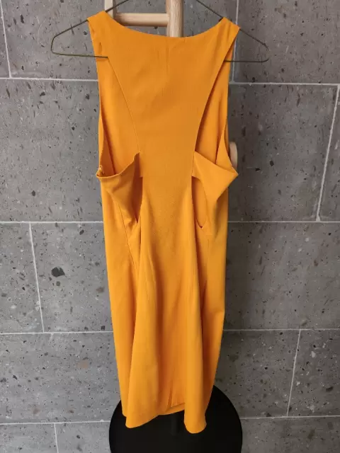 Vestido corto amarillo. Vestido corto (arriba de la rodilla), color amarillo. Sin mangas. La espalda es muy coqueta y tiene dos círculos/hoyos que dejan ver la espalda/piel.