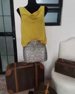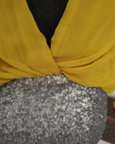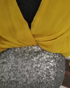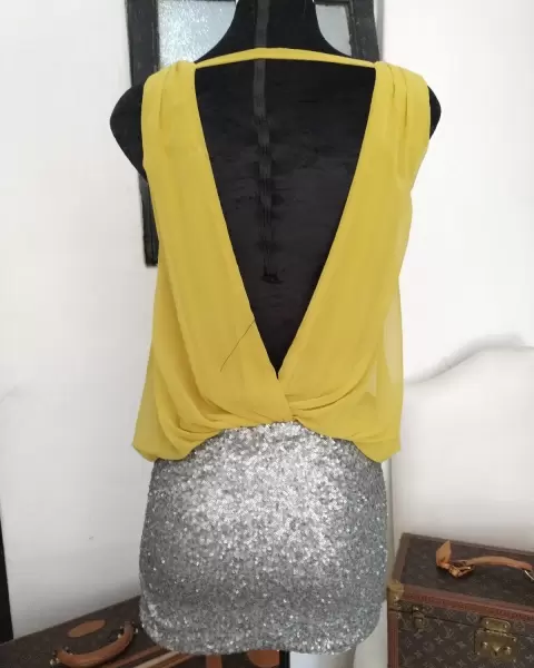Vestido corto amarillo con plata. Vestido talla CH- M corto, falda con lentejuelas en plata. lucirás espectacular con este vestido