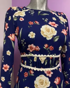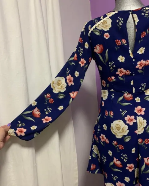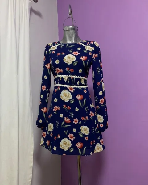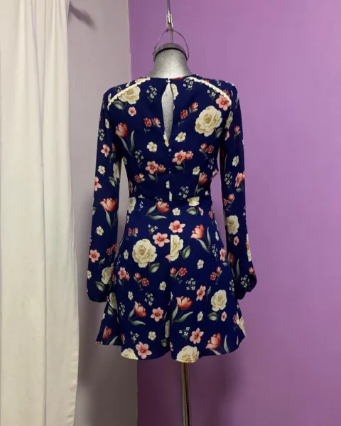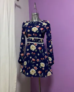 Vestido corto azul rey con flores. Precioso vestidito corto, de manga larga, cuello redondo. Es marca FOREVER 21, talla XS. Medidas: 86cm de largo, 70cm de cintura, 42cm de axila a axila y 63cm de manga.