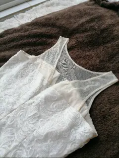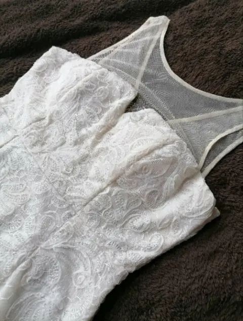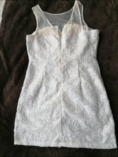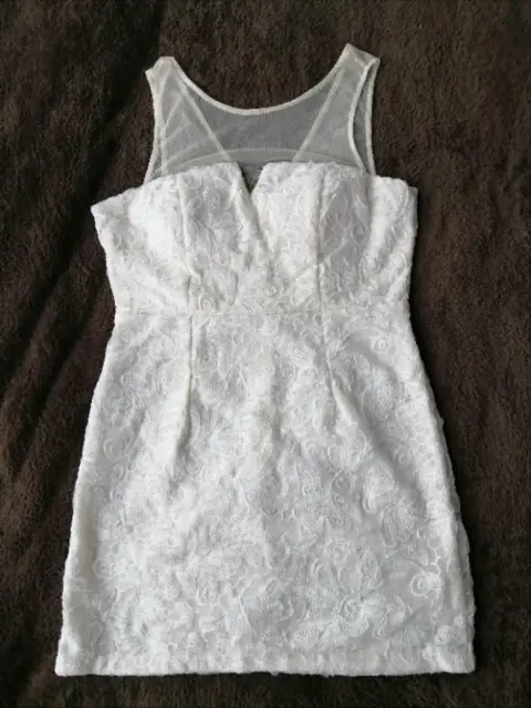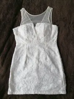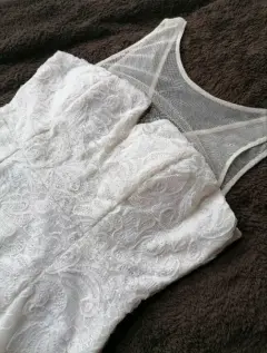 Bonito vestido corto blanco, tela tipo bordada, cierre en la parte de atrás, hace bonita figura, la tela no estira, pero es muy fresca.Talla: LMedidas axila a axila:Cintura:Largo: