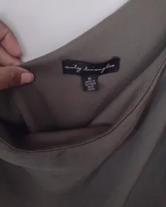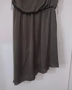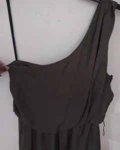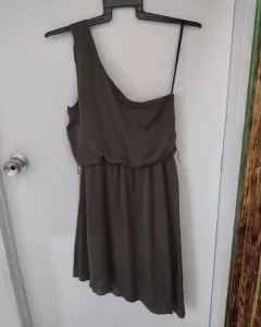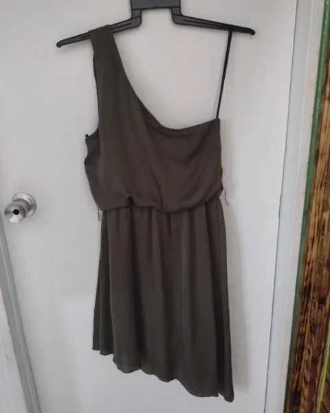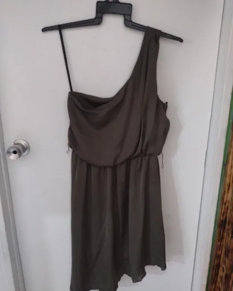 Hermoso vestido juvenil corto sin mangas solo de un lado con tirantes de la parte de abajo es corto de un lado largo del otro en color verde militar tiene una tela transparente arriba y por la parte de abajo un fondo que no permite que se transparente está súper lindo.